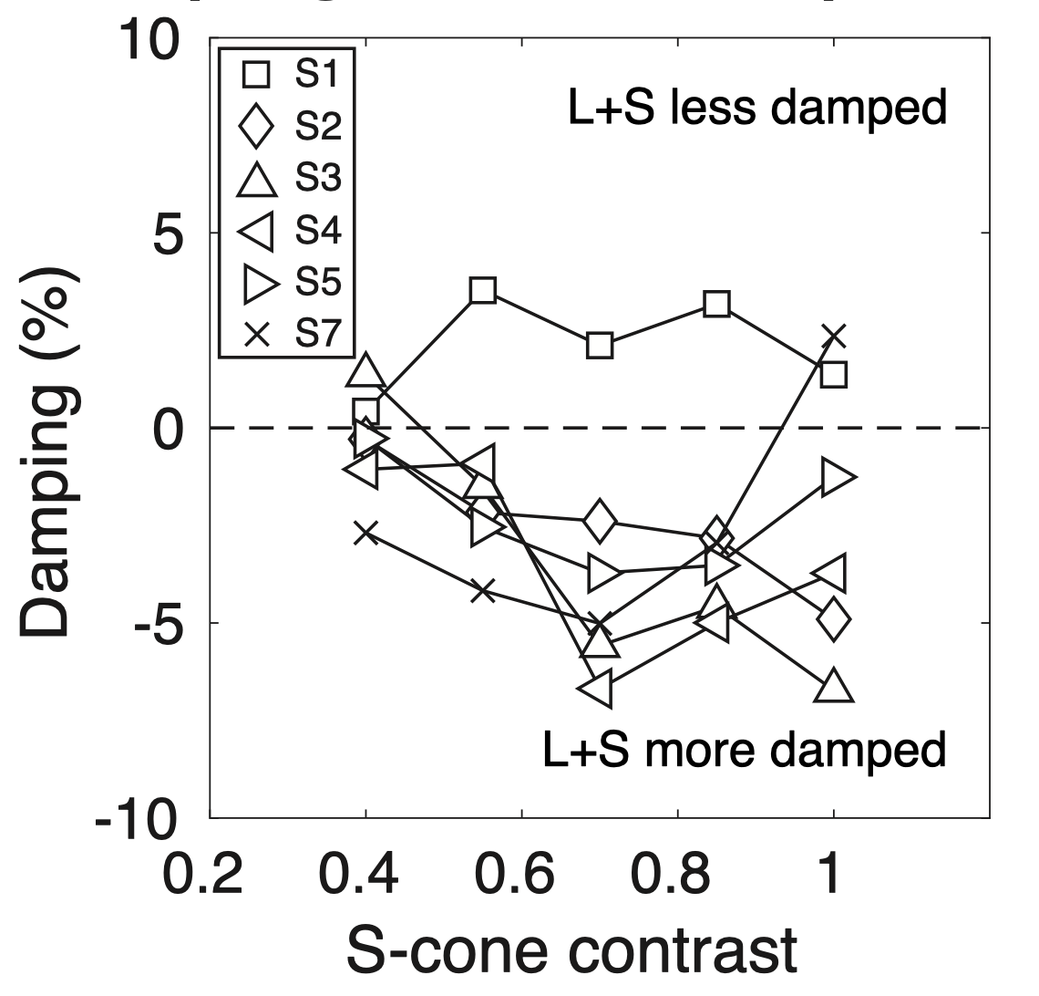 From the magnitude of the Pulfrich effect, we inferred the processing delays and ‘damping’ due to temporal integration associated with different color stimuli. As the contrast of the S-cone modulation increases, both the delay and damping of the combined signal increase. Our results suggest that during motion perception, the combined motion signal does not wait for all information to arrive from the slower (more delayed) S-cone channel, but the extent to which it discards the information depends on the contrast of the S-cone component of the stimulus.
