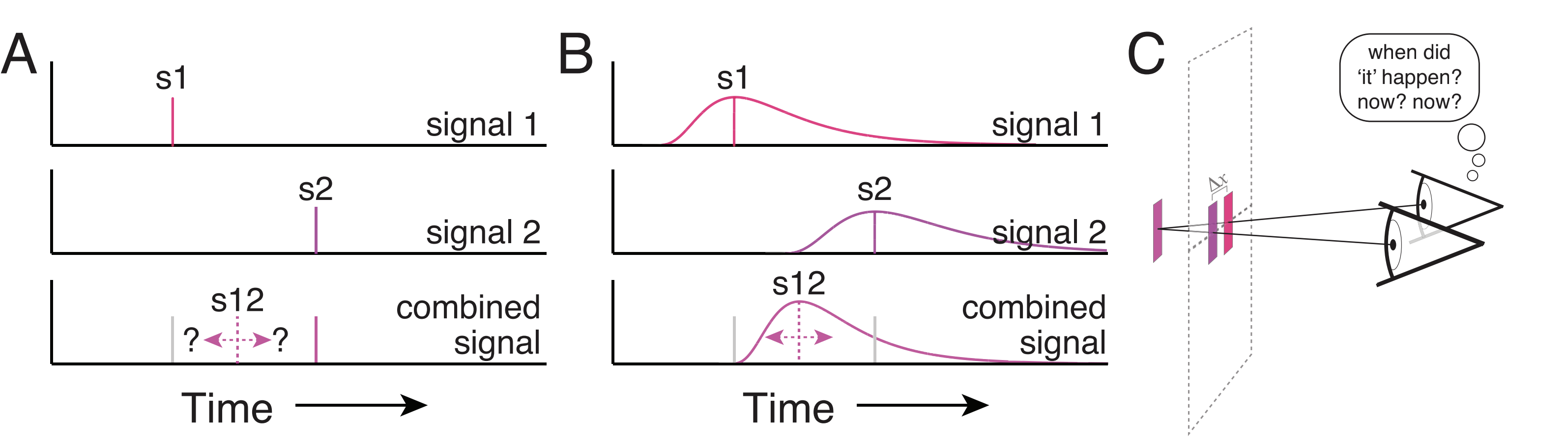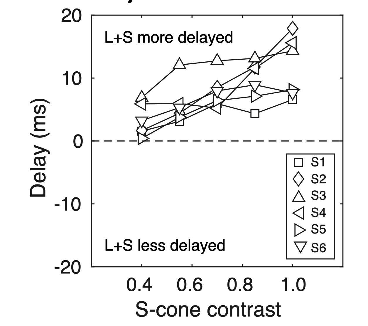Signals in the human visual system typically vary in temporal latency (delay) and integration period depending on the type of information they carry. For example, in color processing, the short-wavelength-sensitive cone photoreceptors in the retina have longer latencies and integration periods than the long-wavelength-sensitive cones. During vision, both types of cones are modulated simultanously. How are their signals combined across time during motion? The answer is not straightforward. Does the visual system wait for all information to arrive, or does it compute motion with partial information?